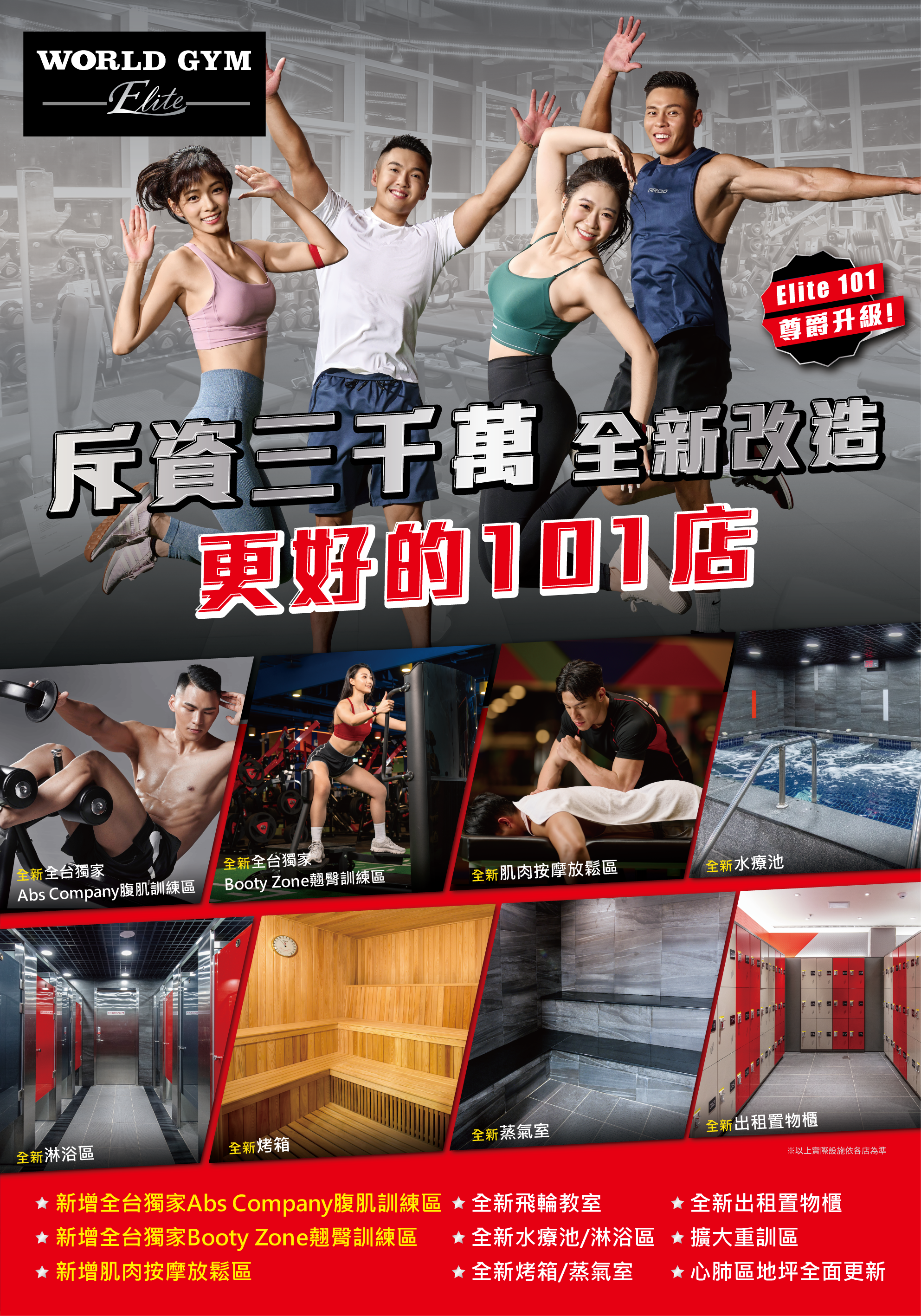 全台獨家Abs Company腹肌訓練區 全台獨家Booty Zone翹臀訓練區全新飛輪教室 全新飛輪教室 全新水療池/淋浴區 全新烤箱/蒸氣室 立即預約參觀101店