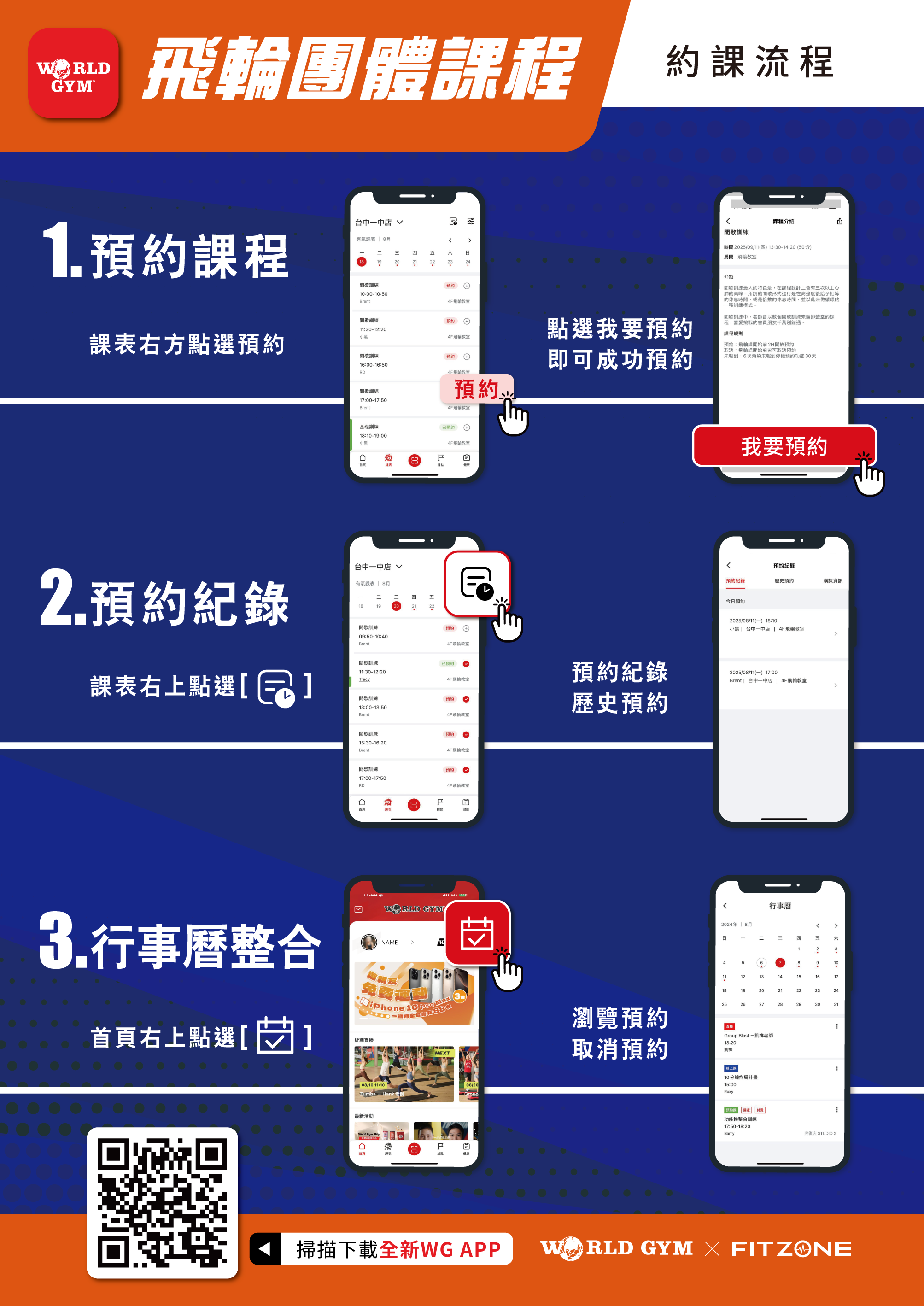 2025/09/08(一)起,即可於WG APP課表上輕鬆操作, 預約、取消、查看一氣呵成,馬上預約喜歡的課程吧! 約課流程: